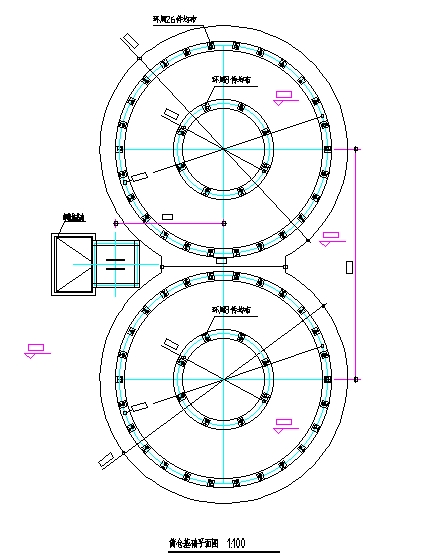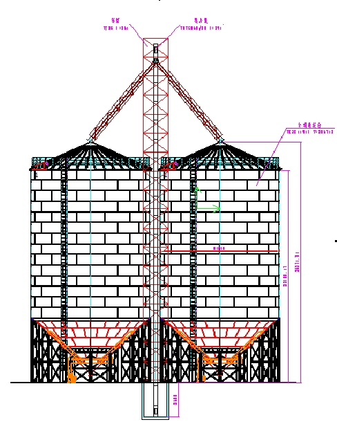 提升機塔架總高36M,提升機卸糧坑下潛3.7M, 提升機凈高39M;兩座倉體大小一致,鋼板倉直徑為11m,錐形倉頂高: 25.37m ,總高 25.8m, 倉頂角 25°,鋼板倉倉頂蓋板為δ1.0mm熱鍍鋅板,選用國產優質熱鍍鋅板,倉頂上設置自然通風窗、人孔、爬梯,倉頂用航空膠泥和防水墊圈密封,沿倉檐四周設有安全防護。