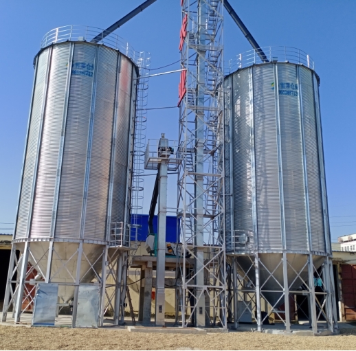 此項目2套300T小麥鋼板倉,其工藝流程如下:糧食經卸糧坑輸送到1號提升機中,糧食經1號提升機輸送到振動篩中,經過振動篩將利用物料與雜質顆粒大小不同的原理,將物料中的雜質,分離出去,再經提升機輸送到頂部,配合電動三通,分別將糧食輸送到2個300T小麥倉中,倉內設有通風和測溫裝置,可以實時檢倉內糧食溫度和濕度變化,達到安全儲糧的作用。