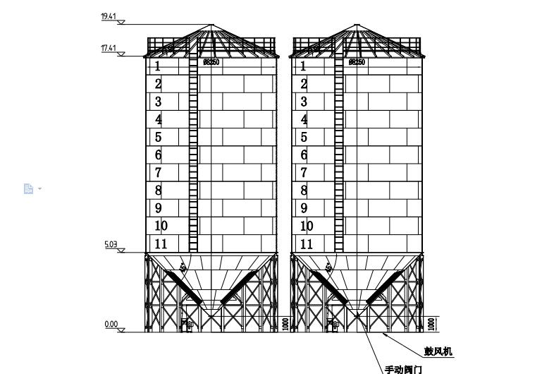 此項(xiàng)目為2套500T玉米鋼板倉,其工藝流程如下:糧食經(jīng)提升機(jī)送到2-500T鋼板倉中,通過測溫系統(tǒng)和鼓風(fēng)機(jī),環(huán)形風(fēng)道保證玉米的安全存儲(chǔ)。